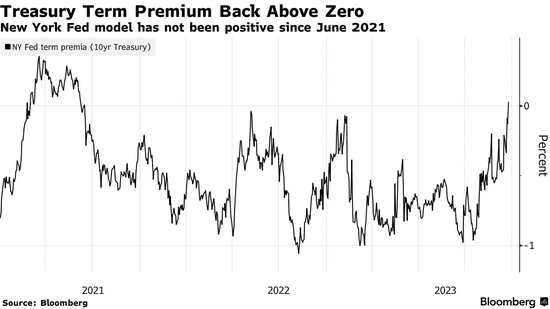 纽约联储的10年期美债溢价指数在过去七年的大部分时间里一直为负值,但在本周一转为正值。该指数估算的是美国国债收益率超出短期利率预期路径的幅度。