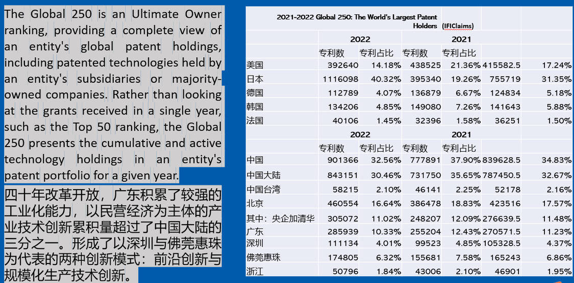 这是美国的数据,美国在250家全球大企业和研究机构累积专利,刚才的专利是当年的新专利,这个专利是250家大企业包括研究机构、大学累计的专利,更加反映它的持续积累速度和创新速度,在这当中我们可以看到2021和2022年中国大陆、中国台湾、北京、广州、深圳以及东莞、佛山、惠州、珠海的情况,可以看到中国大陆目前在250家大企业机构当中专利比重是最高的,在中国大陆当中北京是最高的,占到16%,但是北京和央企、清华、中科院有密切关系,假如把这些央企、清华、中科院去掉之后,北京就不高了。深圳占全球250家的4%,还有佛山、东莞、珠海、惠州,可以看出广东经济向前沿创新靠拢,取得了很大的成就。