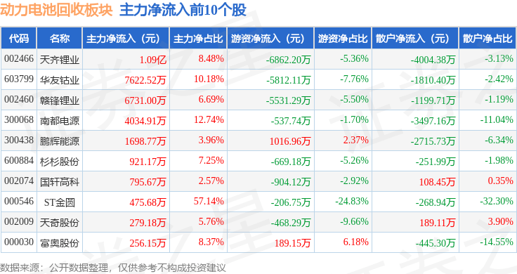 从资金流向上来看,当日动力电池回收板块主力资金净流入5410.02万元,游资资金净流出6050.69万元,散户资金净流入640.67万元。动力电池回收板块个股资金流向见下表: