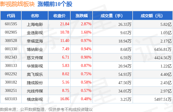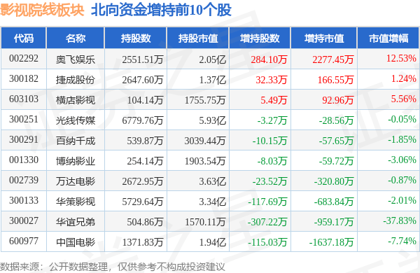 北向资金方面,当日影视院线板块北向资金持股市值为19.59亿元,减持0.38亿元。其中增持最多的是奥飞娱乐,增持了0.23亿元。减持持最多的是上海电影,减持了0.26亿元。影视院线板块北向资金持股变动明细见下表: