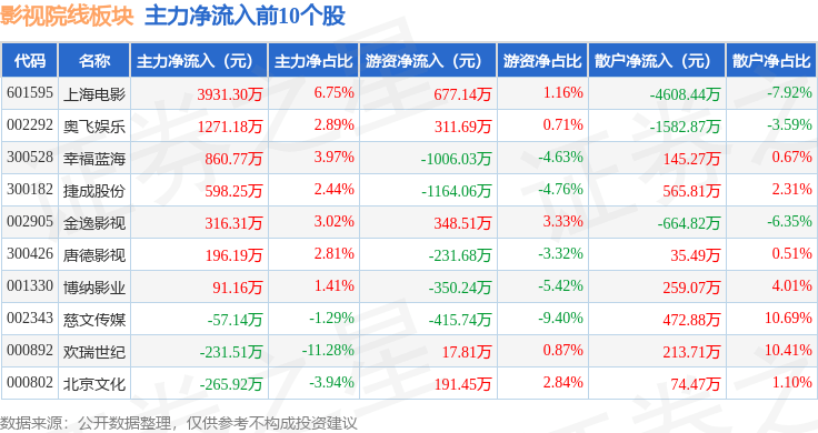 从资金流向上来看,当日影视院线板块主力资金净流出8544.57万元,游资资金净流入5120.65万元,散户资金净流入3423.93万元。影视院线板块个股资金流向见下表: