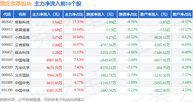 从资金流向上来看,当日国企改革板块主力资金净流出20.2亿元,游资资金净流出12.53亿元,散户资金净流入32.74亿元。国企改革板块个股资金流向见下表: