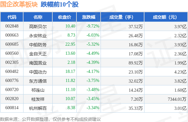 9月27日国企改革板块较上一交易日下跌0.04%,高斯贝尔领跌。当日上证指数报收于3107.32,上涨0.16%。深证成指报收于10104.32,上涨0.44%。国企改革板块个股涨跌见下表:
