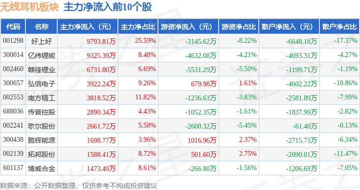 从资金流向上来看,当日无线耳机板块主力资金净流入1.53亿元,游资资金净流出2.69亿元,散户资金净流入1.16亿元。无线耳机板块个股资金流向见下表: