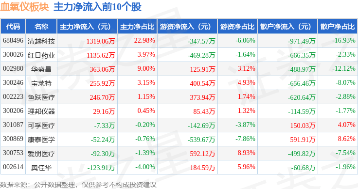 从资金流向上来看,当日血氧仪板块主力资金净流入25.56万元,游资资金净流出481.56万元,散户资金净流入456.0万元。血氧仪板块个股资金流向见下表: