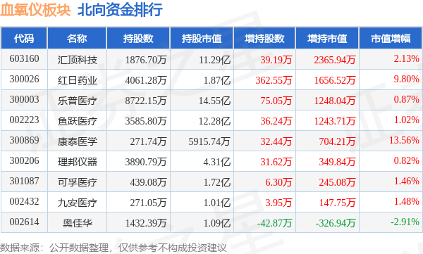 北向资金方面,当日血氧仪板块北向资金持股市值为48.71亿元,增持0.76亿元。其中增持最多的是汇顶科技,增持了0.24亿元。减持持最多的是奥佳华,减持了326.94万元。血氧仪板块北向资金持股变动明细见下表: