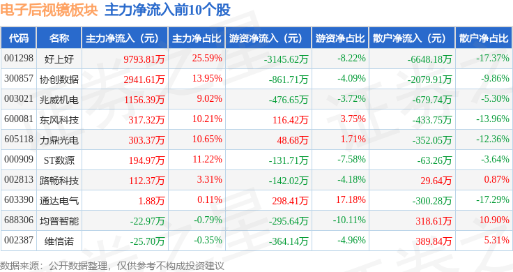 从资金流向上来看,当日电子后视镜板块主力资金净流出2339.49万元,游资资金净流出6131.39万元,散户资金净流入8470.88万元。电子后视镜板块个股资金流向见下表: