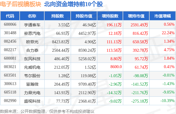北向资金方面,当日电子后视镜板块北向资金持股市值为199.02亿元,减持0.34亿元。其中增持最多的是宇通客车,增持了0.26亿元。减持持最多的是华阳集团,减持了0.21亿元。电子后视镜板块北向资金持股变动明细见下表: