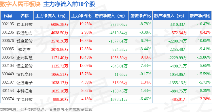 从资金流向上来看,当日数字人民币板块主力资金净流出4.1亿元,游资资金净流出7961.66万元,散户资金净流入4.9亿元。数字人民币板块个股资金流向见下表:
