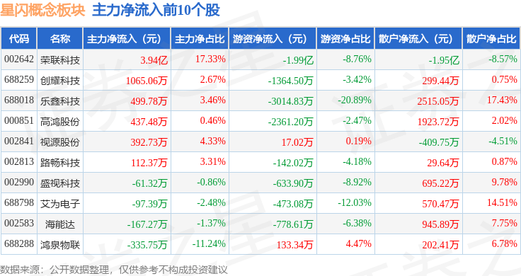 从资金流向上来看,当日星闪概念板块主力资金净流入1.08亿元,游资资金净流出3.2亿元,散户资金净流入2.12亿元。星闪概念板块个股资金流向见下表: