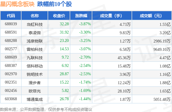 9月27日星闪概念板块较上一交易日下跌0.48%,当虹科技领跌。当日上证指数报收于3107.32,上涨0.16%。深证成指报收于10104.32,上涨0.44%。星闪概念板块个股涨跌见下表:
