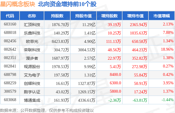 北向资金方面,当日星闪概念板块北向资金持股市值为44.35亿元,减持885.96万元。其中增持最多的是汇顶科技,增持了0.24亿元。减持持最多的是高鸿股份,减持了0.13亿元。星闪概念板块北向资金持股变动明细见下表: