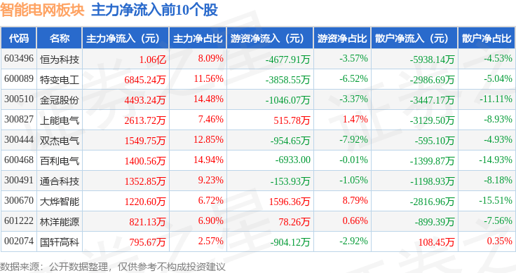 从资金流向上来看,当日智能电网板块主力资金净流出3228.13万元,游资资金净流出2.76亿元,散户资金净流入3.08亿元。智能电网板块个股资金流向见下表: