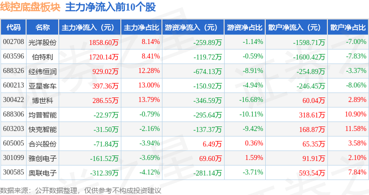 从资金流向上来看,当日线控底盘板块主力资金净流出1480.42万元,游资资金净流出6550.65万元,散户资金净流入8031.07万元。线控底盘板块个股资金流向见下表:
