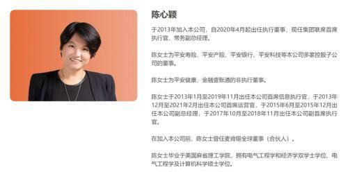 陈心颖今年46岁,于2013年1月加入平安,并分别自2013年1月、2013年12月起担任首席信息执行官、首席运营官,自2015年6月起出任副总经理,于2016年1月转任常务副总经理,并于2017年10月起出任副首席执行官,2018年起担任常务副总经理、联席首席执行官。