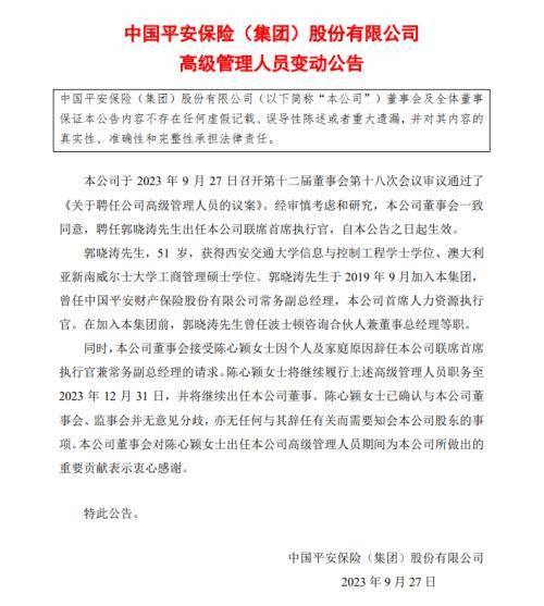 9月27日, 中国平安保险(集团)股份有限公司发布公告称,经审慎考虑和研究,公司董事会一致同意,聘任郭晓涛出任中国平安联席首席执行官,自本公告之日起生效。