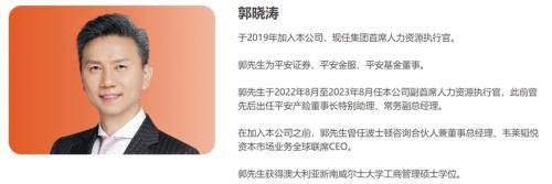 同日,平安宣布,由平安产险董事长孙建平接替郭晓涛出任集团首席人力资源执行官。