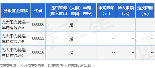 9月28日上海光大证券资产管理有限公司发布《光大阳光优选一年持有期混合型集合资产管理计划暂停申购、转换转入、定期定额投资公告》。公告中提示,为保护集合计划份额持有人利益,自2023年10月9日起光大阳光优选一年持有期混合型集合资产管理计划暂停申购、转换转入、定期定额投资,下属分级基金调整明细如下: