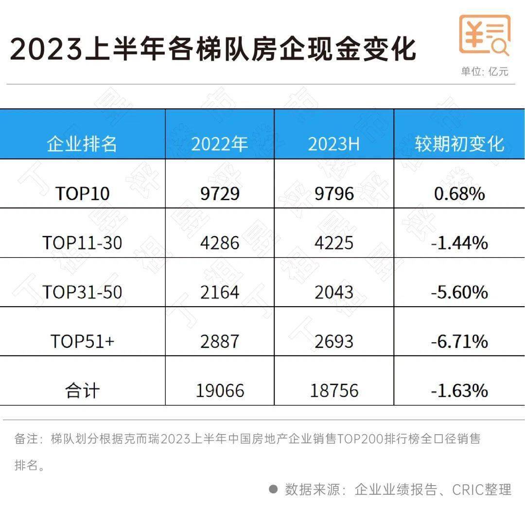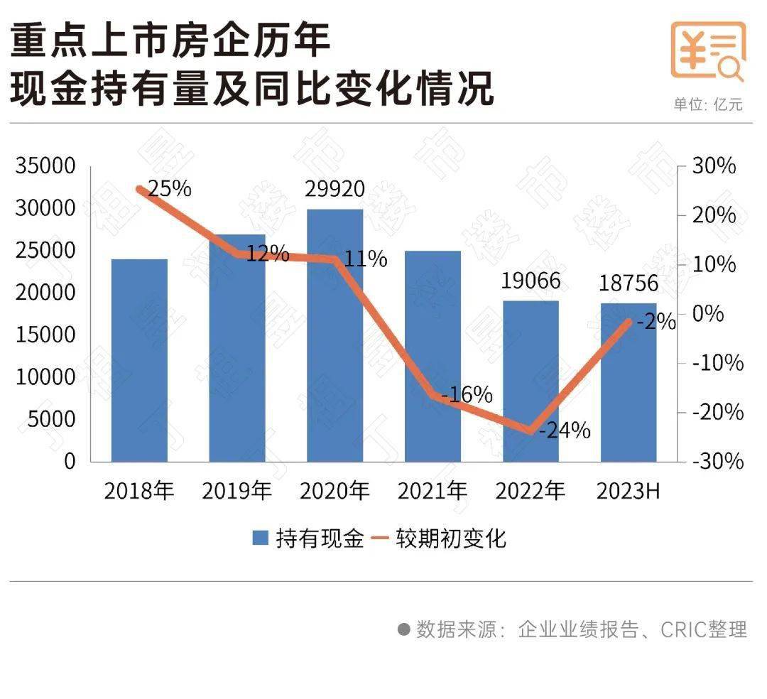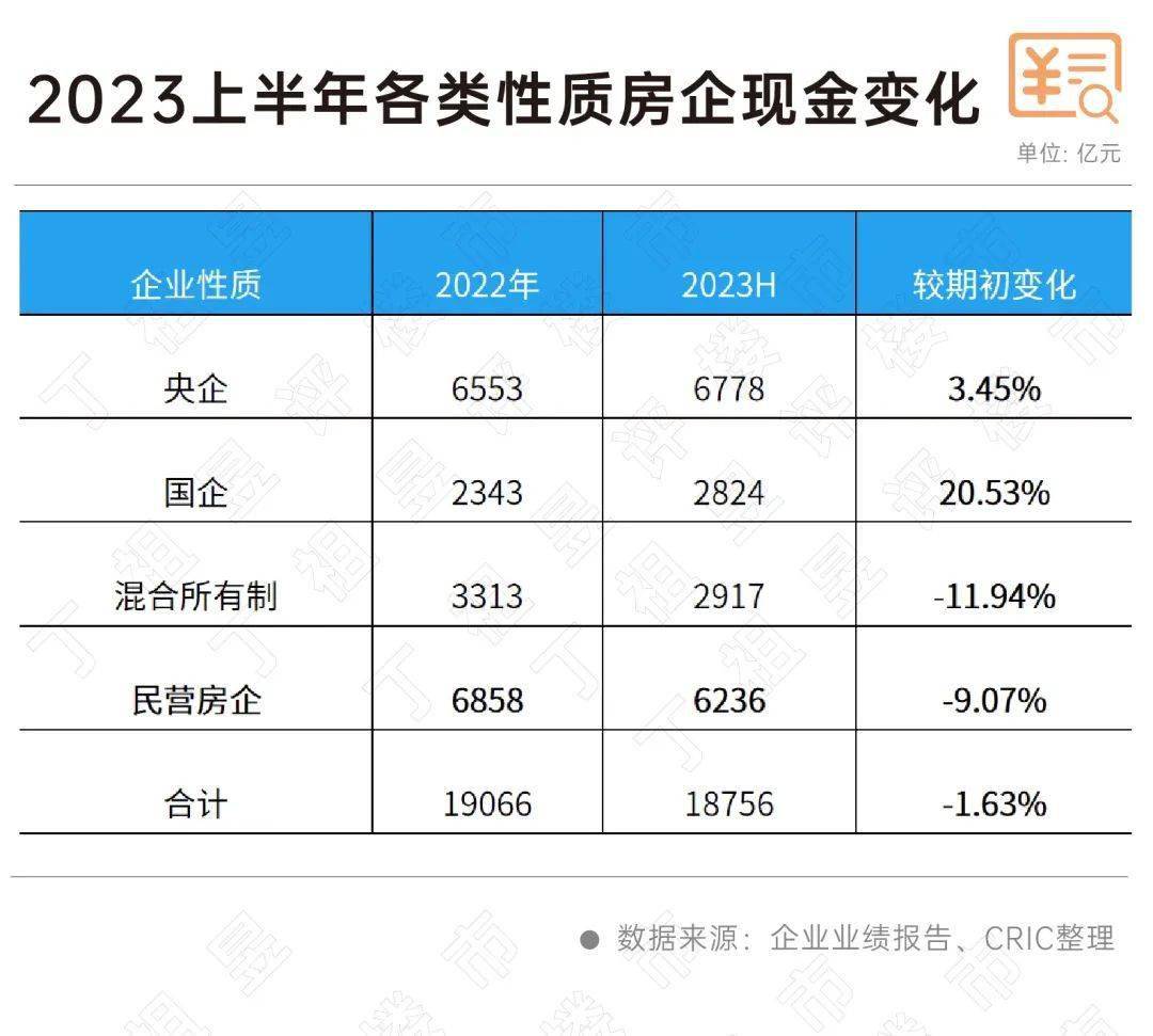 2023年上半年,央企及国企的现金持有量较期初分别上升3%和21%,而民营房企上半年现金持有量为6236亿元,较期初下降了9%。