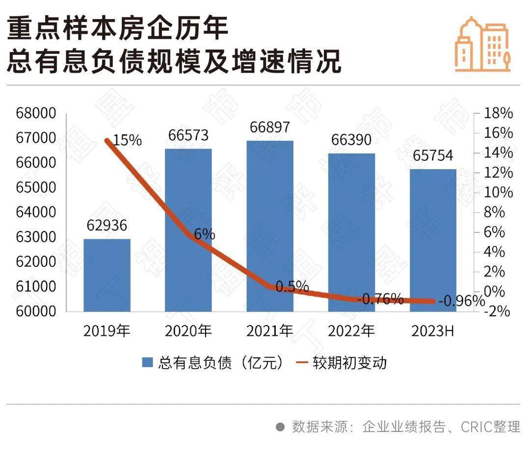 2023年上半年重点样本房企的总有息债规模为65754亿元,较期初略下降0.96%。事实上,房企总有息负债规模自2021年以来增速下降至0.5%,2022年在融资受限的情况下更是出现首次下滑,下降了0.76%。