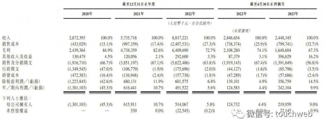 招股书显示,中旭未来2020年、2021年、2022年营收分别为28.72亿元、57.36亿元、88.17亿元;毛利分别为24.39亿元、47.38亿元、64.1亿元;期内利润分别为-13亿元、6.16亿、4.92亿元。