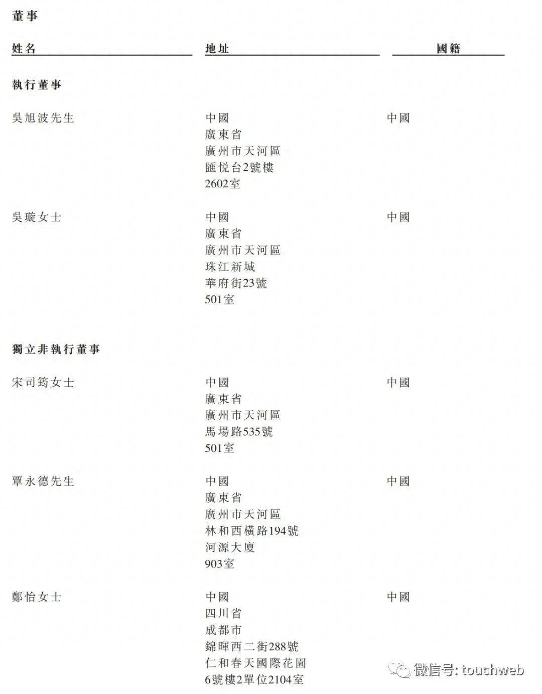 吴旭波为公司主席、首席执行官兼执行董事,吴璇女士为公司首席运营官兼执行董事。