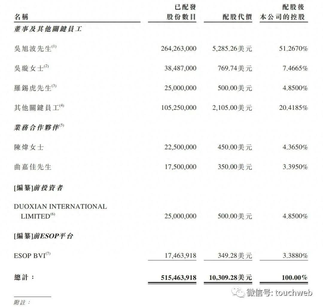IPO前,吴旭波持股为51.267%,吴璇女士持股为7.4665%,罗锡虎持股为4.85%,其他关键员工持股为20.4185%;