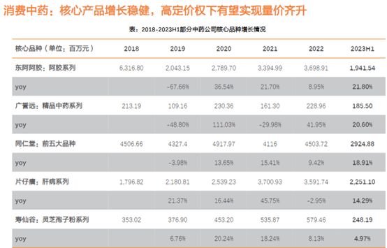 以消费中药为例,天风证券认为其中核心产品增长稳健,高定价权下,有望实现量价齐升。(来源:天风证券《中药行业2023年中期业绩总结》)