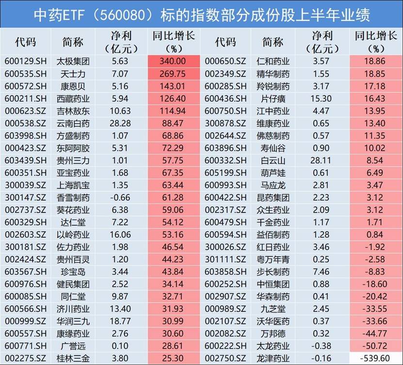 中药ETF(560080)标的指数50只成份股已全部发布2023年上半年度业绩报告。太极集团以实现净利润归母净利润5.63亿元,同步增长340%,位列首位。天士力实现净利润7.07亿元,归母净利增270%;康恩贝、西藏药业、吉林敖东实现100%以上增速;云南白药、东阿阿胶、上海凯宝、亚宝药业、方盛制药等也都实现上半年净利大幅增长!板块业绩整体高增!