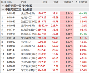 全市场维度上,在124个申万二级行业中,中药板块盘中涨幅高居Top7,而在今日(9.28)涨幅靠前的15个行业中,中药板块近5日涨幅超5%,高居第一!