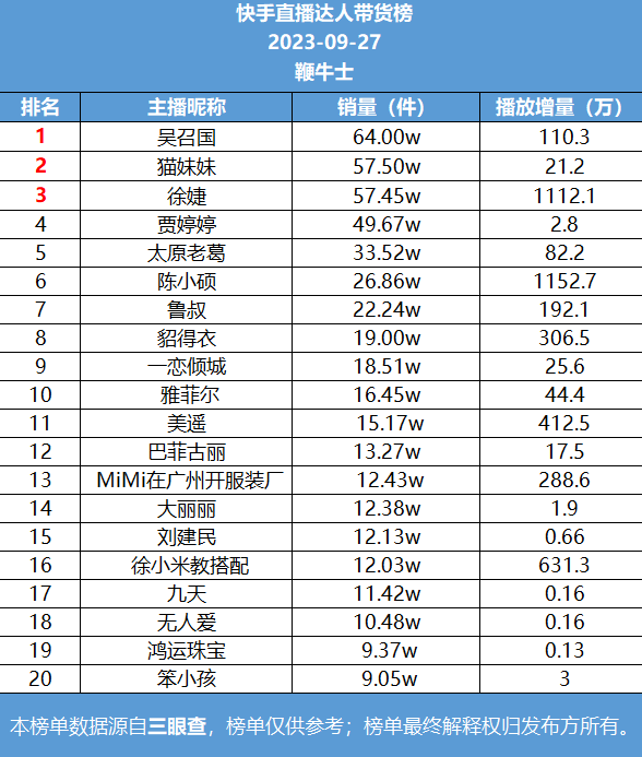 快手榜一吴召国,销量64万件;榜二是猫妹妹,销量57.5万件;榜三徐婕,销量57.45万件。