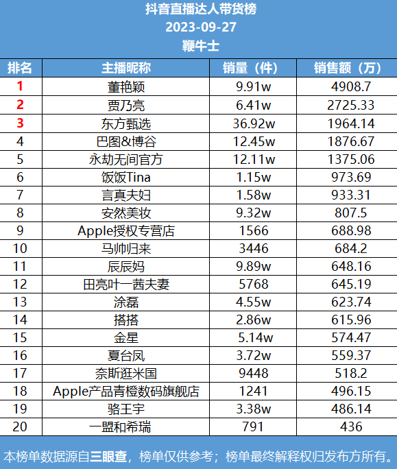 9月27日,抖音直播达人带货榜一是董艳颖,销售额4908.7万;榜二贾乃亮,销售额2725.33万;榜三东方甄选,销售额1964.14万。