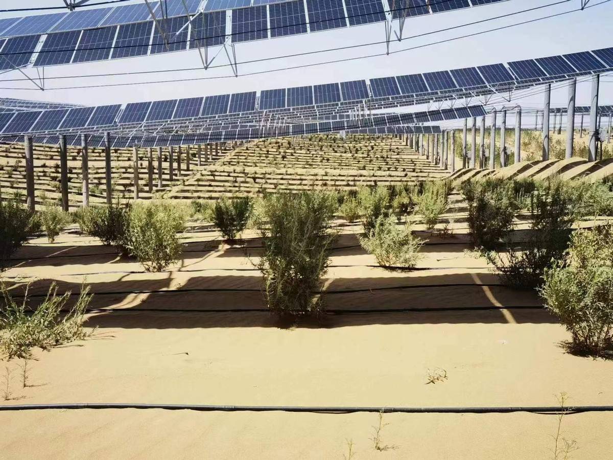 2021年,在“双碳”战略下,国家首批大型风电光伏基地在我国西部沙区陆续开工建设。甘肃省引进亿利立体生态光伏治沙模式和技术,由亿利洁能在甘肃武威投资建设50万千瓦立体生态光伏治沙产业化示范项目于当年10月开工建设。项目主要建设光伏电站、“农光互补”种植试验区、“牧光互补”养殖区、生态修复牧草区和防风林带区,这也是武威市实施的国家第一批以沙漠、戈壁、荒漠地区为重点的风电光伏大基地项目。项目同时在光伏区周边建设100米宽的防风阻沙林带,并种植60米宽的樟子松、花棒、柠条混交碳汇林,在项目主通道两侧种植20米宽的樟子松、花棒、柠条混交行道树,构成光伏发电区域防止沙尘暴侵袭的第二道防线。在光伏板间建设养殖区,发展生态鸡、绵羊养殖。同时利用禽畜粪便改良土壤,增加土地肥力。将武威城区排放的3000万立方米/年的城市中水引入到光伏治沙园区,在板下规划高效节水农业,种植花棒、沙打旺、沙米、四翅滨藜等沙生植物2.1万亩,变荒漠为“绿地”,利用独特的光伏产业产品吸引旅客,发展工业旅游,一产变多产,形成了光伏治沙新模式,使沙漠“无人区”变成新的“淘金地”。