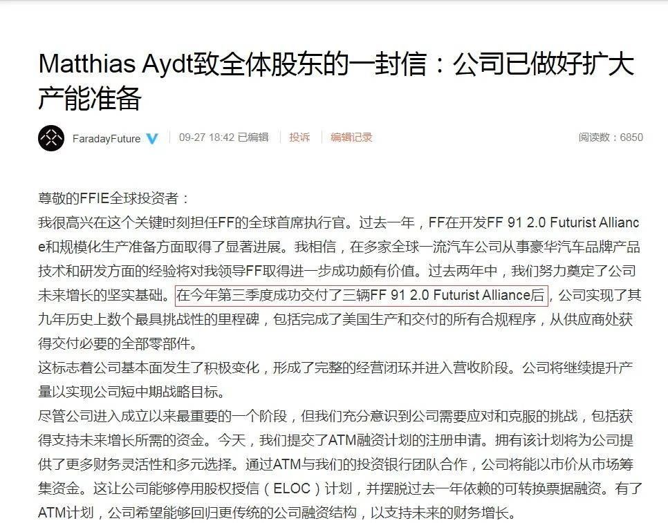 9月27日,法拉第未来官方公布了FF全球首席执行官Matthias Aydt致全体股东的一封信。