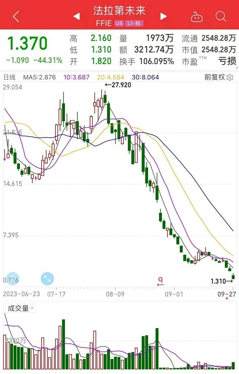 近一个月来,Faraday Future(法拉第未来,下称“FF”)股价节节下跌,截至当地时间9月27日收盘,法拉第未来报1.37美元,跌幅44.31%。其市值跌破3000万美元关口,最新报2548.3万美元。