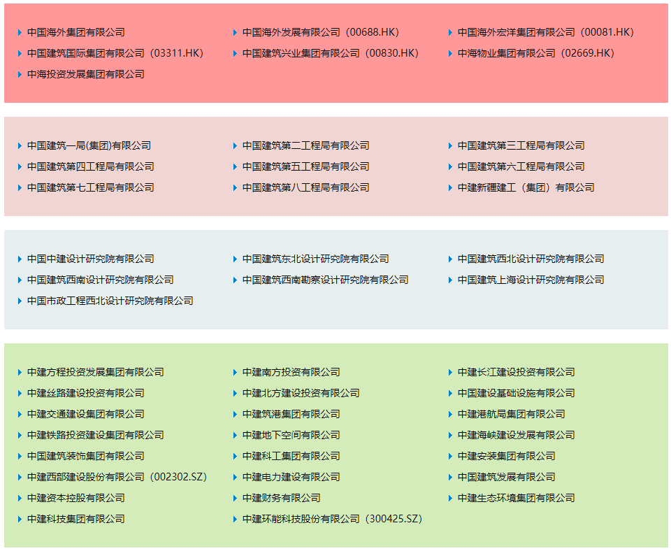 官网显示,中国建筑集团有限公司主要以上市企业中国建筑(601668.SH)为平台开展经营管理活动,拥有上市公司8家,二级控股子公司100余家,中国海外发展(00688.HK)、中国海外宏洋(00081.HK)、中海物业(02669.HK)、中建一局等均是其子公司。