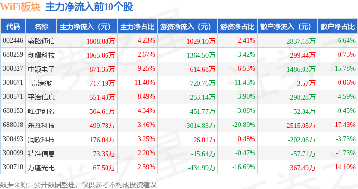 从资金流向上来看,当日WiFi板块主力资金净流出7.41亿元,游资资金净流出7838.92万元,散户资金净流入8.19亿元。WiFi板块个股资金流向见下表: