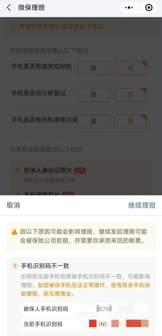 但王吉说道,此后他尝试通过其他手机进行申请,并登陆其他微信账号,也出现了同样的问题,理赔界面或者显示识别码不一致,或者显示“获取失败”。“当初购买保险时已经生成了手机识别码,现在登陆授权又生成一个新的识别码,而这个识别码与手机本身的IMEI和SN码都不一致,并且换不同的手机就生成不同的码,这样操作如何能验证是我的手机,又怎么能以此为由拒绝理赔?”王吉对此非常疑惑。
