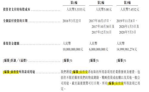 招股书显示,菜鸟分别于2016年、2017年、2019年进行了三轮融资,融资额分别为100亿元、60亿元、149.9998亿元。