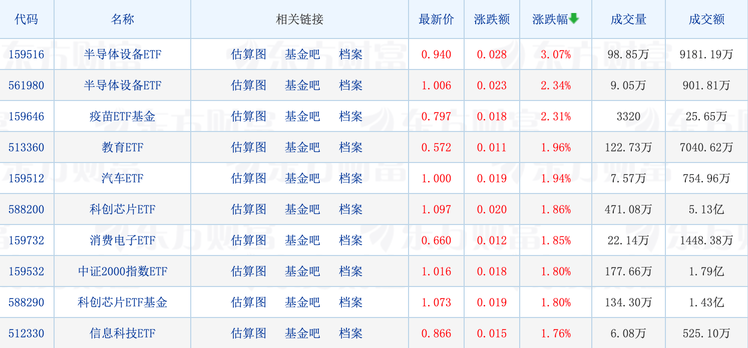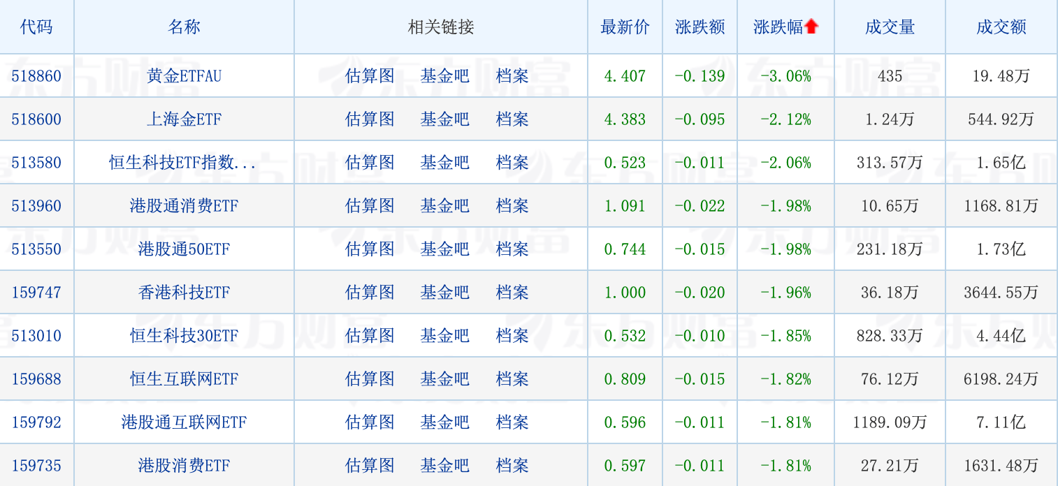 下跌方面,港股恒生科技指数回调超1.5%,带动港股科技相关ETF展开回调,最高下跌2.06%。