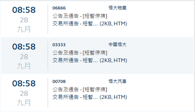 9月28日,中国恒大、恒大汽车、恒大物业在香港交易所暂停交易。