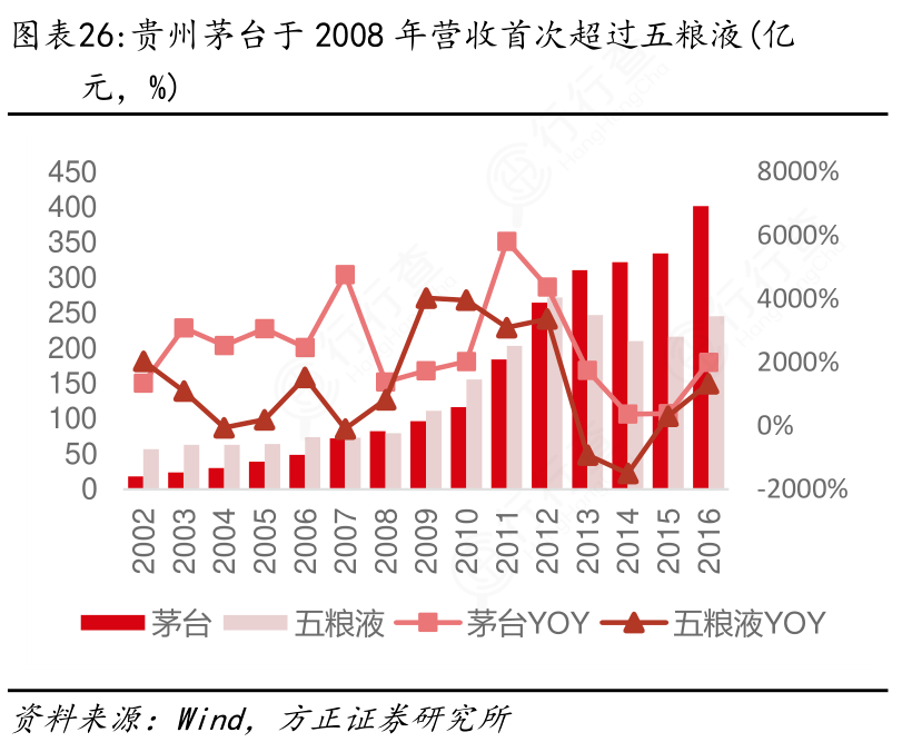 但是由于早期的产品定位和销售模式的影响,五粮液在2013年被贵州茅台超越后,就再也没能重回行业第一。而贵州茅台则在行业周期下,逐渐占领高端白酒市场,奠定了品牌的高端形象。