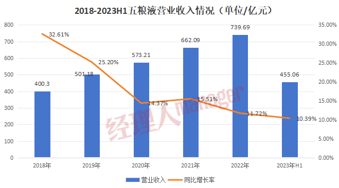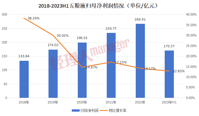 拉长时间维度来看,2018年-2022年,五粮液实现营业收入400.30亿元、501.18亿元、573.21亿元、662.09亿元、739.69亿元,同比增长率分别为32.61%、25.20%、14.37%、15.51%、11.72%,整体呈现下滑趋势;同期归母净利润分别为133.84亿元、174.02亿元、199.55亿元、233.77亿元、266.91亿元,同比增长率分别为38.26%、30.02%、14.67%、17.15%、14.17%,同样呈现整体下滑趋势。