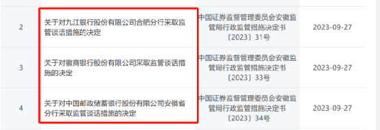 9月27日晚间,安徽证监局一连发布三份《行政监管措施决定书》,涉及邮储银行安徽省分行、九江银行合肥分行,还有徽商银行。部分银行或分行存在基金销售人员、相关负责人等存在“无证上岗”,没有将基金销售保有规模、投资人长期投资收益等纳入分支机构和基金销售人员考核评价指标体系等违规行为,被采取监管谈话的行政监管措施。