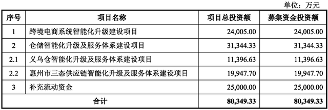 三态股份本次IPO拟募集资金8.03亿元,主要用于公司跨境电商系统智能化升级建设项目、仓储智能化升级及服务体系建设项目、义乌仓智能化升级及服务体系建设项目、惠州市三态供应链智能化升级服务及服务体系建设项目以及补充流动资金。