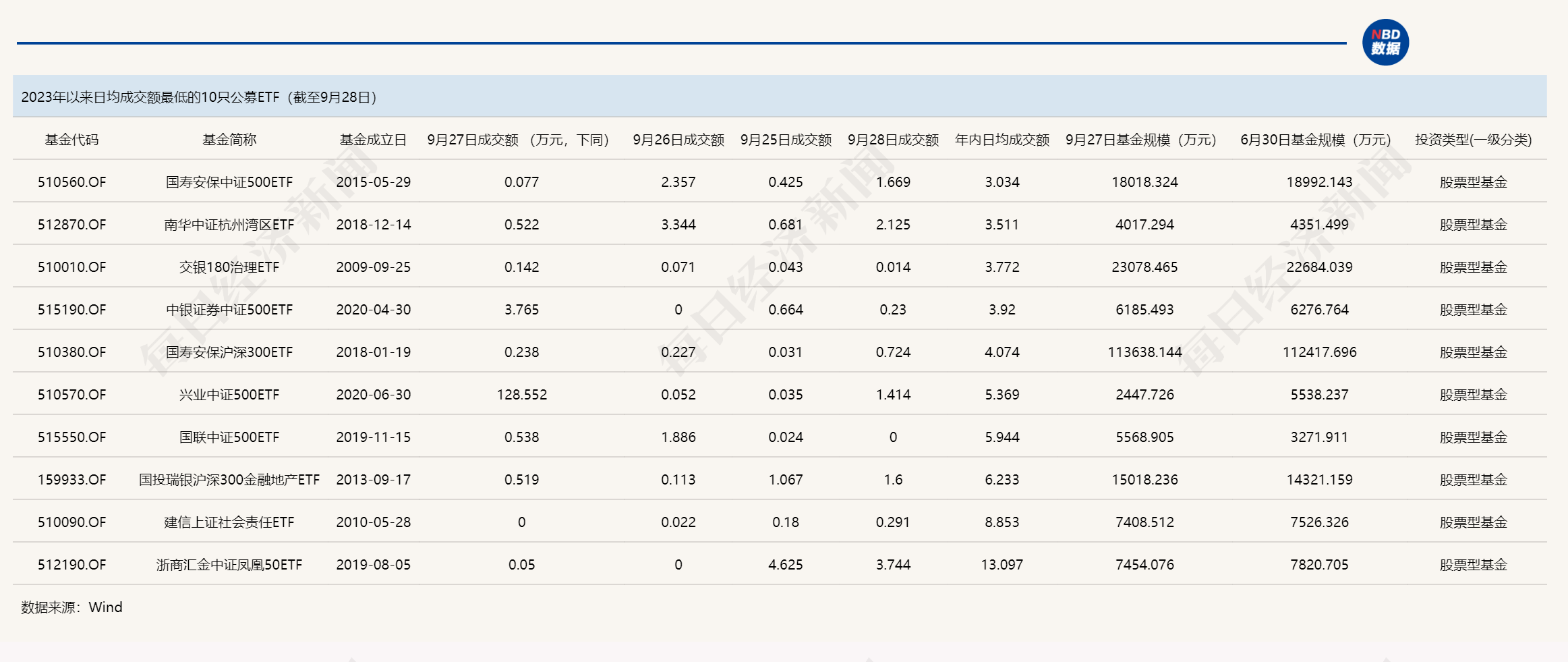 今年年初至9月28日,日均成交金额最少的五只ETF分别为——国寿安保中证500ETF、南华中证杭州湾区ETF、交银180治理ETF、中银中证500ETF、国寿安保中证500ETF,同期日均成交额依次为3.03万元、3.51万元、3.77万元、3.92万元、 4.07万元。日均成交金额不足千万元的ETF数量则是达到了321只,占ETF总量的37.85%。