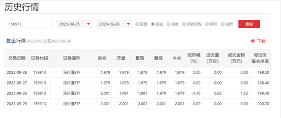 9月25日,交银深证300价值ETF的成交额为0。这只成立于2011年9月的ETF,在本周4个交易日里,已有3次单日成交额为0的尴尬情况。9月20日,深价值ETF的日成交额也为零。纵观9月,深价值ETF日成交额为零的情况出现了4次。