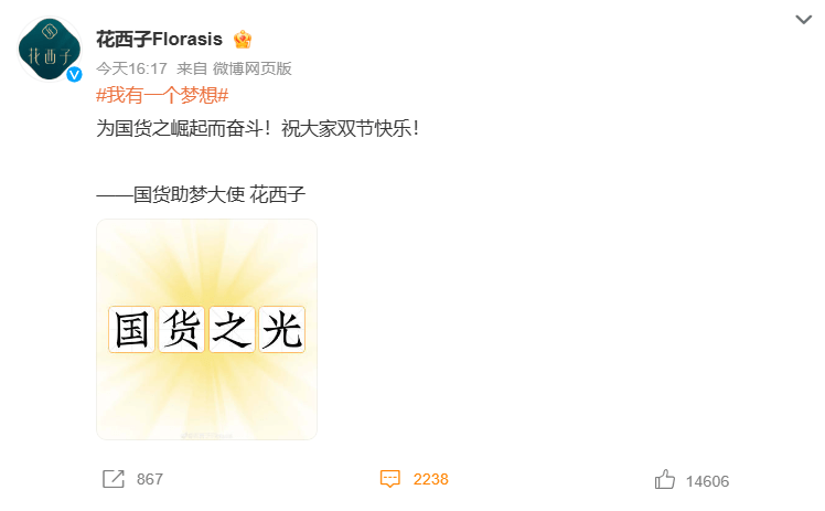 据悉,此前花西子发文称“我,花西子,6岁半,我有一个梦想,做一个立足本土,走向世界的高端品牌。”网友称花西子助力国货每一个梦想。