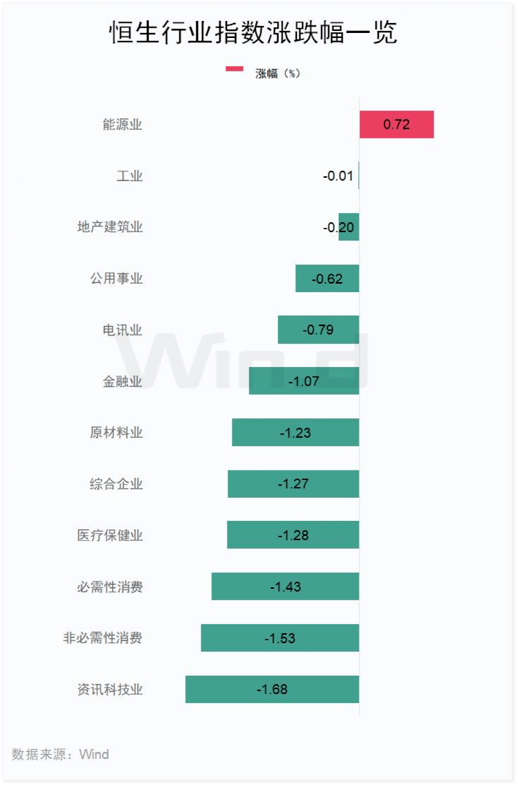 从行业表现看,恒生行业指数日内多数下跌,资讯科技业跌1.68%,非必需性消费跌1.53%,必需性消费跌1.43%。涨幅方面,能源业涨0.72%。