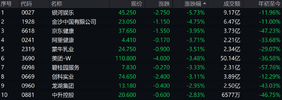 科技、博彩、消费股跌幅居前,银河娱乐跌5.73%,金沙中国跌4.75%,京东健康跌3.95%,领跌蓝筹。